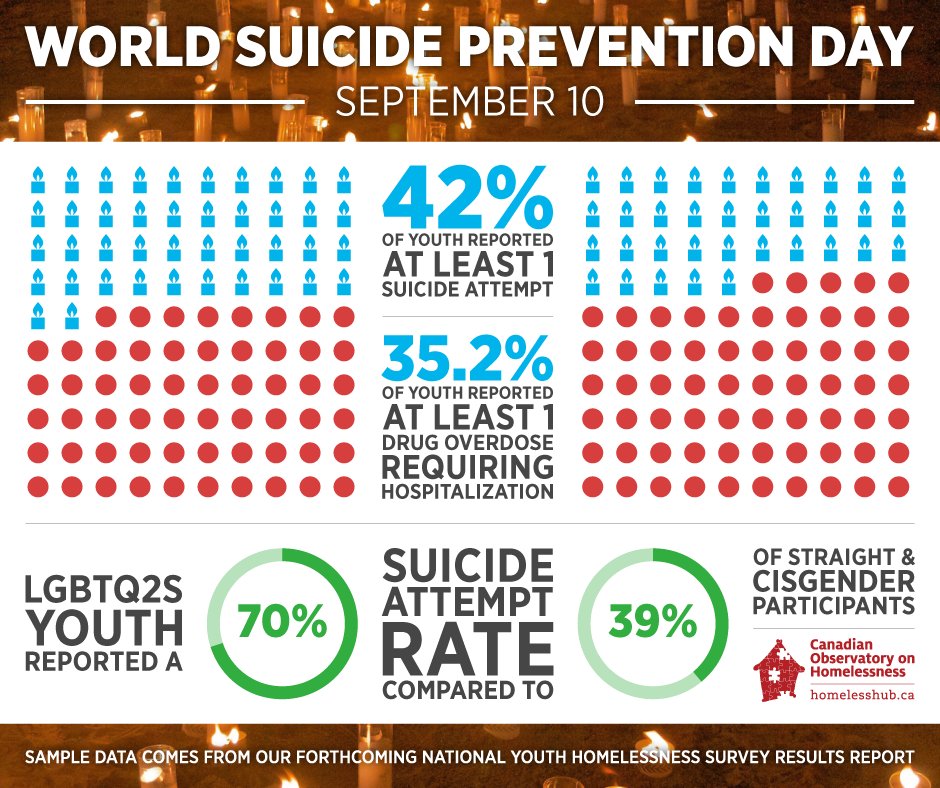 Selon les données préliminaires d’une enquête du Homeless Hub / Rond Point de l’itinérance sur les jeunes et l’itinérance, 42% des jeunes en situation d’itinérance ont fait part qu’ils avaient fait au moins une tentative de suicide. Le rapport sera rendu public cet automne.